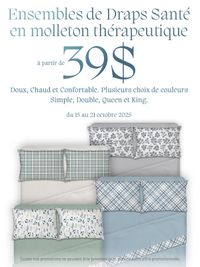 Spécialisés en literie et vêtements pour toute la famille, nous offrons plus de 70 modèles de douillettes, un grand choix de couleurs de draps, ainsi que des accessoires comme des oreillers et des housses de couette. Toutes les tailles de lits sont disponibles.